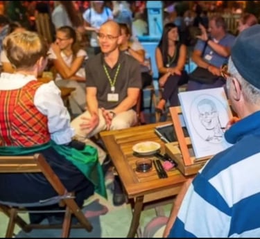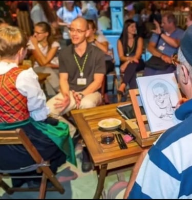 This is not about implementing your concepts, but about Leonardo’s own artistic signature and spectacular live performance. Leonardo draws lightning-fast, charmingly, and with refined humor. Quick-fire caricatures & unique edible art using chocolate, coffee, perfume & wine.